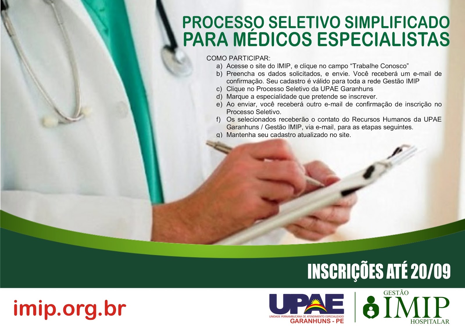 IMIP, e clicar no mesmo site, no link de inscrição do Processo Seletivo da UPAE