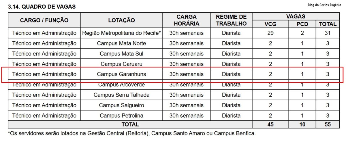 Para Garanhuns, há três vagas destinadas ao cargo de Técnico em Administração – diarista, com remuneração de R$ 1.518,00, jornada de 30 horas semanais e exigência de curso técnico em Administração, com carga mínima de 800 horas. Entre as atividades previstas para a função estão elaboração de relatórios, realização de pesquisas para estudos administrativos, produção de documentos institucionais e suporte às demandas acadêmicas e de gestão.