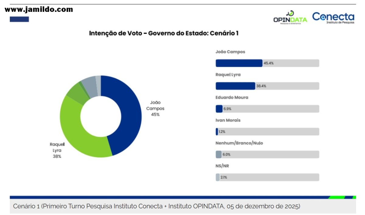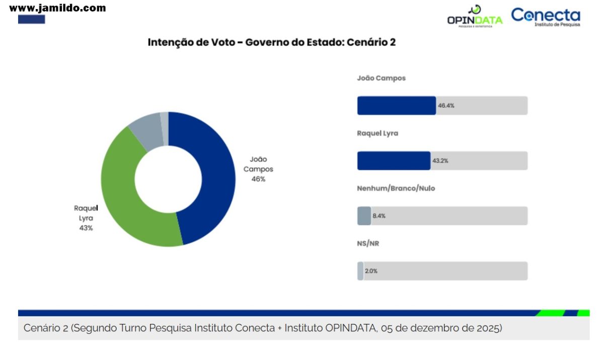 A disputa pelo Governo de Pernambuco no próximo ano promete ser acirrada. A mais recente pesquisa realizada pela CONECTA Pesquisas, em parceria com o Instituto OPINDATA, entre os dias 1º e 5 de dezembro, revela que a diferença entre o Prefeito do Recife, João Campos (PSB), e a governadora Raquel Lyra (PSD) diminuiu significativamente. O levantamento, que ouviu 10 mil pessoas de forma online, foi divulgado nessa sexta-feira, dia 5, pelo portal Jamildo.com.
