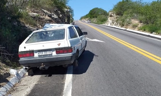 trafegam pela BR 424. Um veículo está abandonando as margens da Rodovia, na