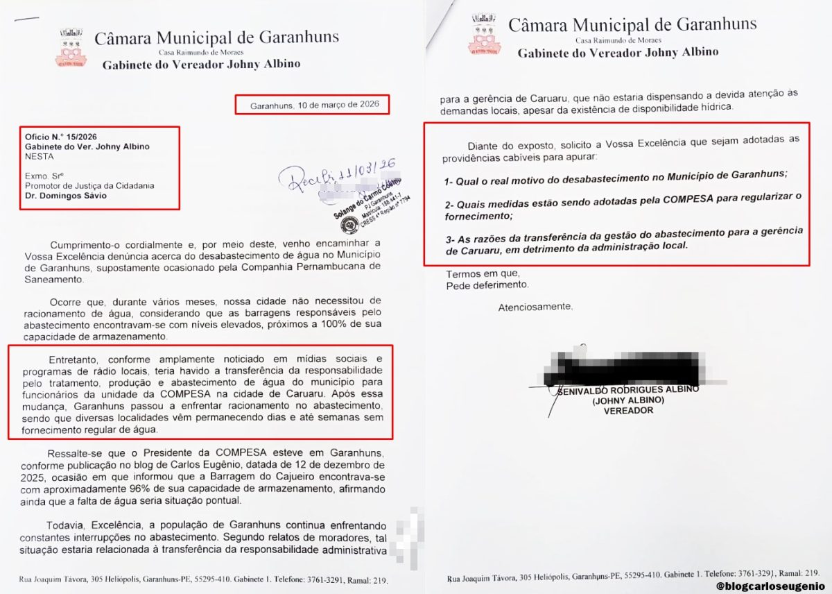 No documento encaminhado ao Ministério Público, Johny Albino solicita a apuração de três pontos principais: o real motivo do desabastecimento em Garanhuns, as medidas que estariam sendo adotadas pela Compesa para regularizar o fornecimento e as razões da transferência da Gestão do sistema de abastecimento para a gerência de Caruaru.