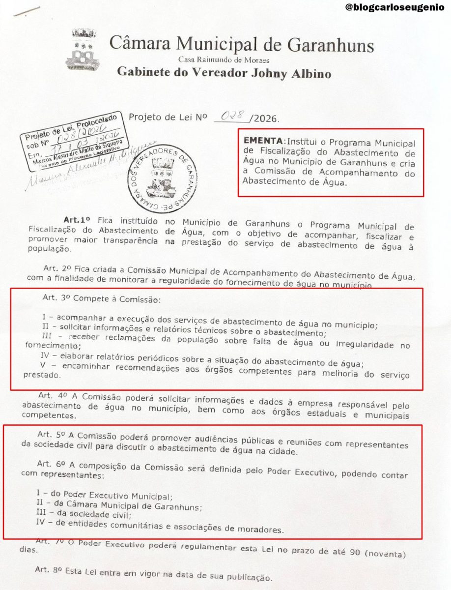 O vereador Johny Albino (PSB), que preside a Câmara de Garanhuns, apresentou o Projeto de Lei nº 028/2026, que propõe a criação de um Programa Municipal de Fiscalização do Abastecimento de Água em Garanhuns, além da instituição de uma Comissão para acompanhar e monitorar o serviço no Município.