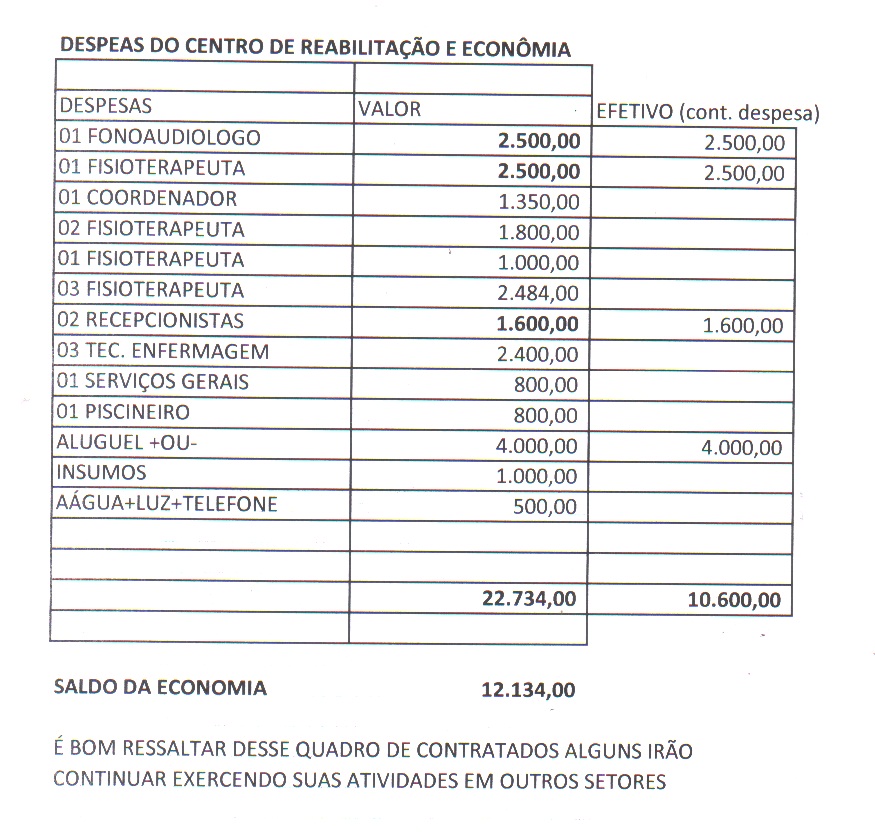 Confira o quadro de custos do Centro de Reabilitação divulgada pelo Vereador Sivaldo Albino: