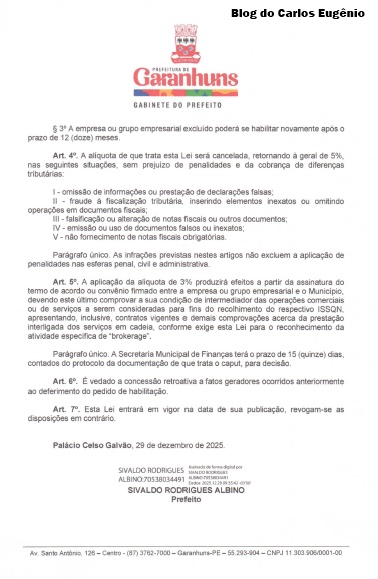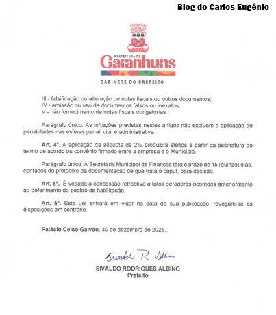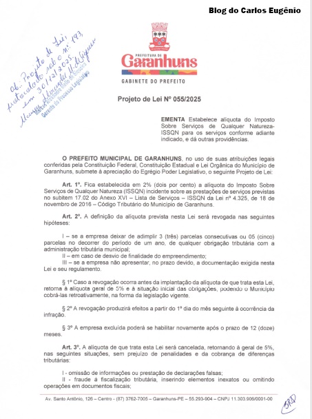 Já o Projeto de Lei nº 055/2025 fixa a alíquota do ISSQN em 2% para serviços enquadrados no subitem 17.02 da Lista de Serviços do Município (apoio e infraestrutura administrativa e congêneres). Assim como o PL anterior, a proposta estabelece critérios rígidos para manutenção do benefício fiscal, prevendo a perda do incentivo em situações de fraude, inadimplência ou descumprimento das obrigações legais. Para baixar o Projeto de Lei nº 055/2025 clicando AQUI. Especula-se que o ramo empresarial que contará com o Incentivo será um CallCenter (Central de Atendimento). A informação ainda não foi confirmada pelo Governo de Garanhuns.