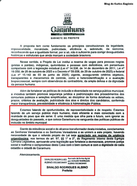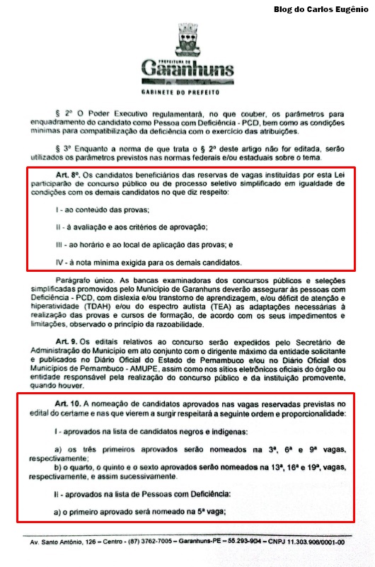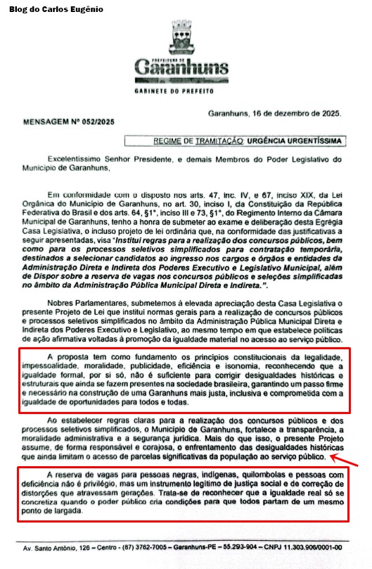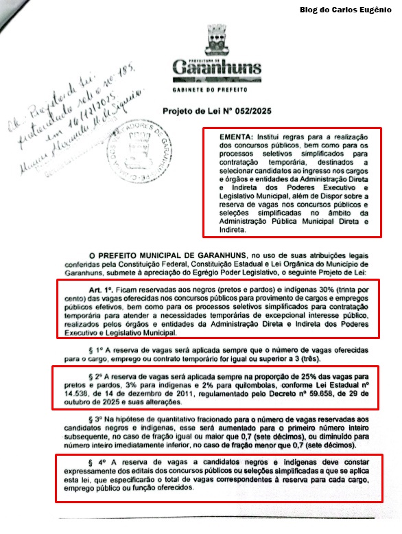 Caso seja aprovado, o Projeto não se aplicará a concursos e seleções cujos editais já tenham sido publicados. A regulamentação da nova Lei deverá ser feita pelo Prefeito de Garanhuns no prazo de até 90 dias após a publicação. (@blogcarloseugenio)