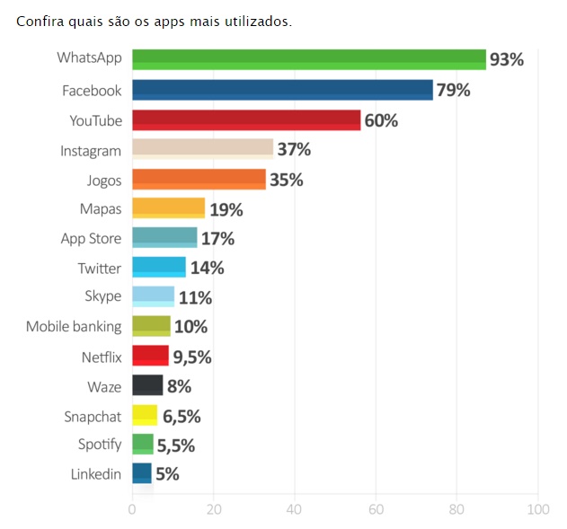 brasileiros revela que o WhatsApp é usado por 93% deles, o que o torna o app